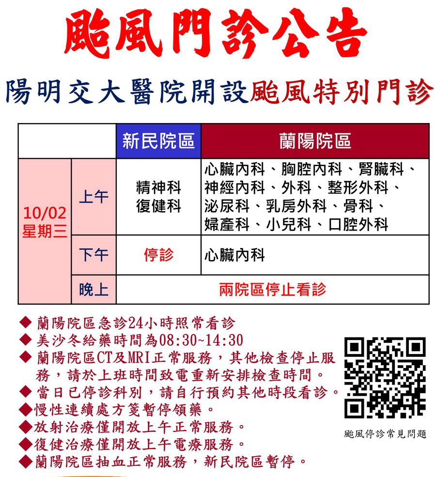陽明交大附設醫院表示,因宜蘭縣政府發佈10月2日(三)停班公告,該院開設颱風特別門診,詳情看診資訊可上醫院網站查詢。所屬院區相關醫療服務資訊如下: