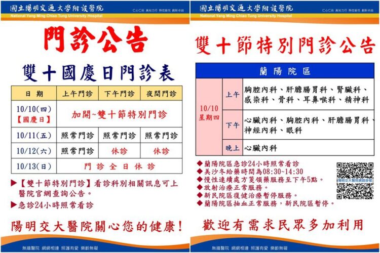 陽明交大醫院將於雙十國慶假期開設「雙十節特別門診」,持續提供醫療服務,讓有就醫需求的民眾不必擔心假期無法就診。