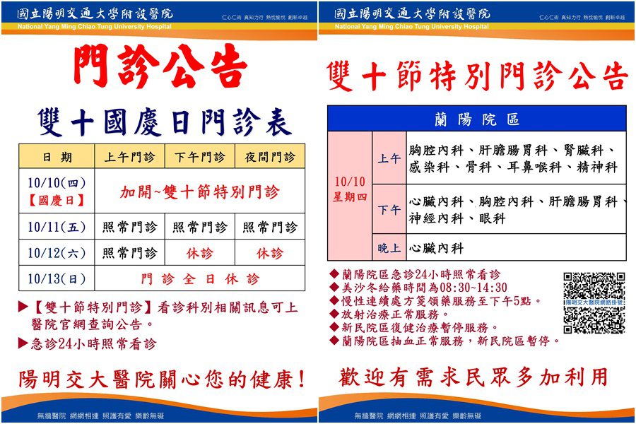 陽明交大醫院楊純豪院長表示,該院秉持「以病患為中心」的理念,在雙十假期在蘭陽院區安排專業醫療團隊全天候提供多科門診服務,無間斷地守護病患健康。希望不論何時,病患的健康需求都能得到及時的滿足,健康的守護永不間斷。