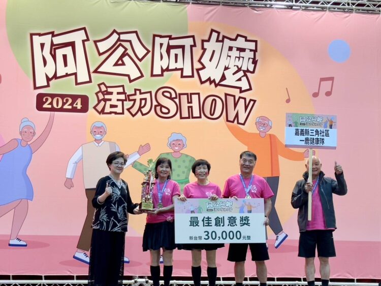 「2024阿公阿嬤活力SHOW」長者活躍老化競賽分北中南東4區選拔,全台共19隊進入總決賽,29日在新北市板樹體育館舉行全國總決賽,嘉義縣由南區競賽金獎的「鹿草鄉三角社區一鹿健康隊」代表參賽,榮獲最佳創意獎。