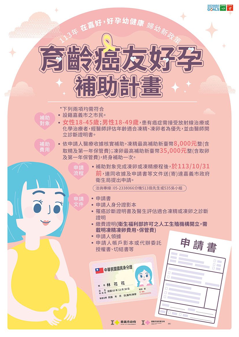衛生局長廖育瑋說明,「育齡癌友好孕補助計畫」不限嘉義市的人工生殖機構、補助費用全國最高。設籍嘉義市、經醫師診斷且評估適合凍卵凍精者皆可申請。截至10月底已協助33歲女性何杰金氏淋巴瘤及37歲男性肺癌癌友接受凍精凍卵療程。