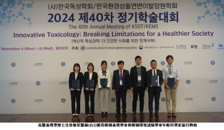 第40屆韓國毒理學會與韓國環境誘變學會聯合年會(KSOT-KEMS)於2024年11月4日至6日在韓國釜山舉行,主旨為「創新毒理學:突破限制,邁向更健康的社會」,為學者提供一個高水準的學術交流平台,促進對毒理學前沿議題的探索與討論。高雄醫學大學毒理學博士學位學程博士生曾敏峯醫師,榮獲此聯合年會的「年輕科學家旅行獎助」。該獎項今年僅提供六個名額,專門為國際優秀青年學者設立,旨在表揚於毒理學領域的卓越研究成果學者並鼓勵其持續精進。