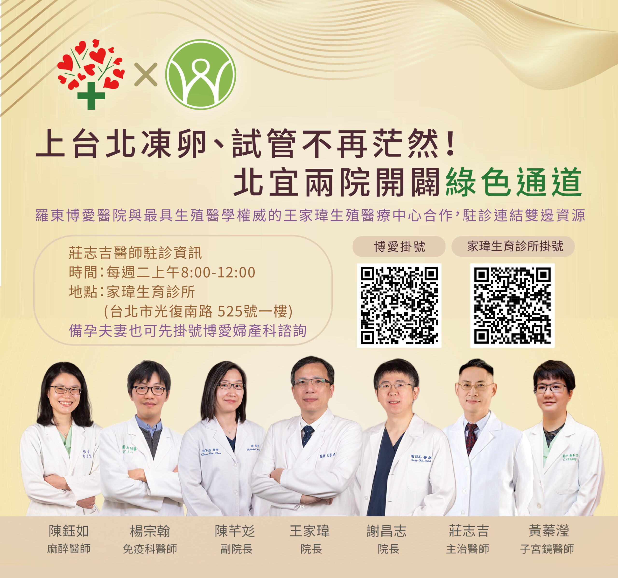 宜蘭34歲曾小姐因慢性骨盆腔發炎導致難以受孕,在羅東博愛醫院婦產科醫師莊志吉與王家瑋生殖醫學中心建立的北宜綠色通道合作下,曾女半年內成功懷孕,今年8月產子,一圓當媽夢想!