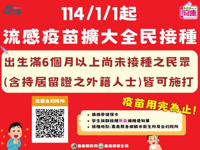 縣長翁章梁表示,流感疫苗自今年10月開打,嘉義縣人口接種涵蓋率達24.3%,接種疫苗雖無法完全避免感染,卻是降低重症與死亡最有效的方式,鑒於全台流感重症與死亡數創新高,為提升疫苗接種人口涵蓋率,發揮疫苗最大效益,自明(114)年1月1日起,公費流感疫苗擴大提供6個月以上尚未施打的民眾接種,嘉義縣流感疫苗僅剩1萬劑,呼籲未接種疫苗的民眾可至嘉縣合約院所,或善用各鄉鎮市村里行動醫療巡迴服務前往接種,儘速獲得防護力。