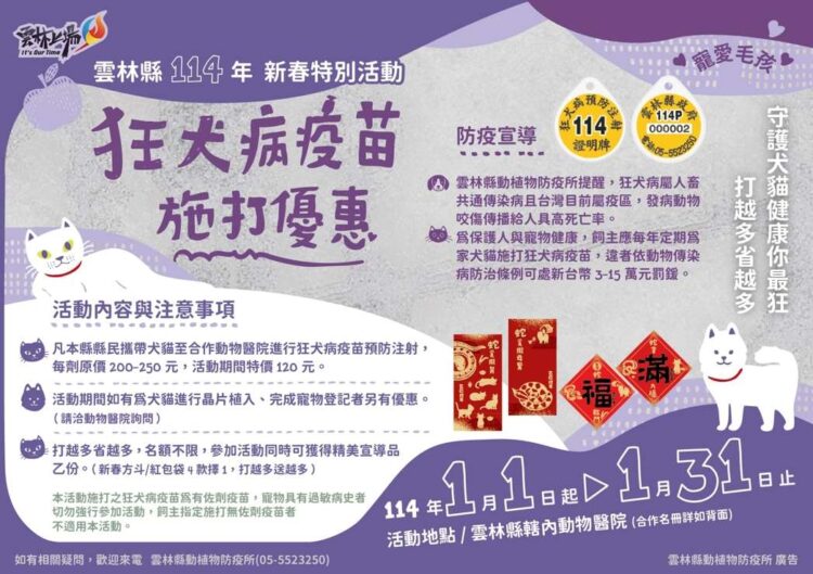 關心動物照顧福利、防範狂犬病傳播,雲林縣動植物防疫所將在114年1月1日至31日舉行「新春特別活動-狂犬病疫苗施打優惠」,歡迎民眾踴躍攜帶家犬貓至轄內21家配合動物醫院施打狂犬病疫苗,注射費每隻只收120元(原價200-250元),名額不限,同時贈送限定精美宣導品,打一隻領一份、打越多送越多。