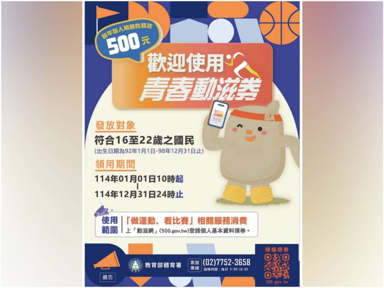 體育署鼓勵青年朋友趁著春節假期走出家門,前往運動場館,感受運動的快樂與魅力。無論是揮灑汗水還是欣賞賽事,青春動滋券讓你的新年充滿活力與希望。更多活動詳情與合作店家資訊,請上「動滋網」查詢,或撥打客服專線02-77523658。