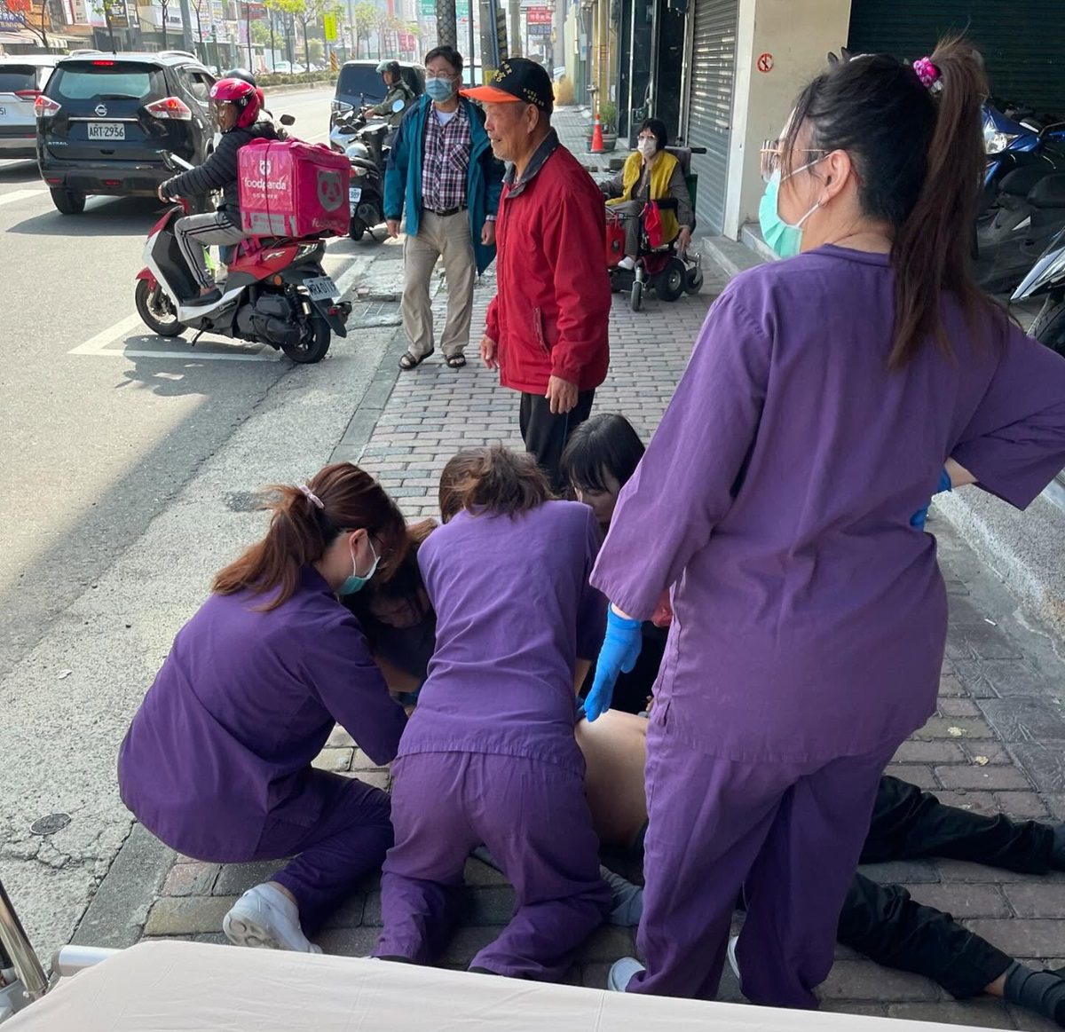 主任陳建甫說,今天值班離開醫院準備去吃中餐,聽到附近有人大聲求救,發現有民眾說躺在地上的老先生是因吃麵包吃到噎到,臉色都發紫失去意識,他衝上前去先以哈姆立克法急救,結果梗在喉嚨的麵包無法吐出來,之後讓對方躺平開始CPR,按壓幾下後,看到阿伯吐出一些麵包,此時急診室同仁也推著床並帶著氧氣桶趕到,接手繼續急救,並將患者口中麵包挖出來,再送到員生急診,患者經搶救後恢復呼吸心跳。