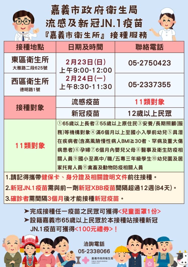 因應防範國內流感疫情升溫,嘉義市再獲衛生福利部疾病管制署配給1,510劑流感疫苗,衛生局宣布2月20日至22日開辦的3場社區接種站皆已預約額滿,因此東、西區衛生所分別於2月23日上午9-12時加開假日門診、2月24日上午開設門診,提供流感及新冠JN.1疫苗接種服務,現場發放號碼牌,額滿為止。