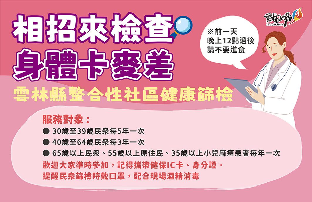 雲林縣政府衛生局重視鄉親們健康管理,每年於各鄉鎮市偏遠地區辦理「相招來檢查身體卡麥差」整合性社區健康篩檢活動,自今年起結合6家責任醫院及基層醫療診所共同辦理 24 場次,提供成人健康檢查、B、C 型肝炎篩檢、四癌篩檢(子宮頸癌、大腸癌、口腔癌、乳癌)及胸部X光篩檢骨質密度;另設籍雲林縣 65 歲以上民眾還可增加「長者健康檢查」,包含肝癌篩檢、甲狀腺功能檢查、心電圖檢查等,請民眾把握顧健康的機會。