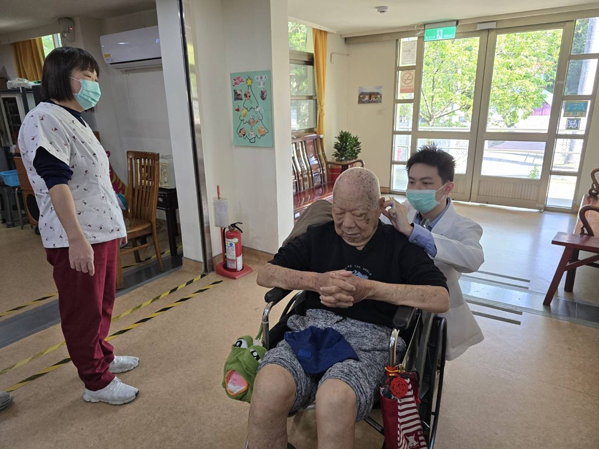 為了讓行動不便的住民也能獲得適切的醫療照護,彰化榮家於今(114)年2月中起與員榮醫院攜手合作,每周一增設中醫門診,特別強調「走動式診療」服務。吳晉廷中醫師除了在診間看診外,還會主動到養護區房舍為行動不便的住民進行問診、針灸及相關治療,讓身體不便的長者不必出門,就能享受專業醫療服務。