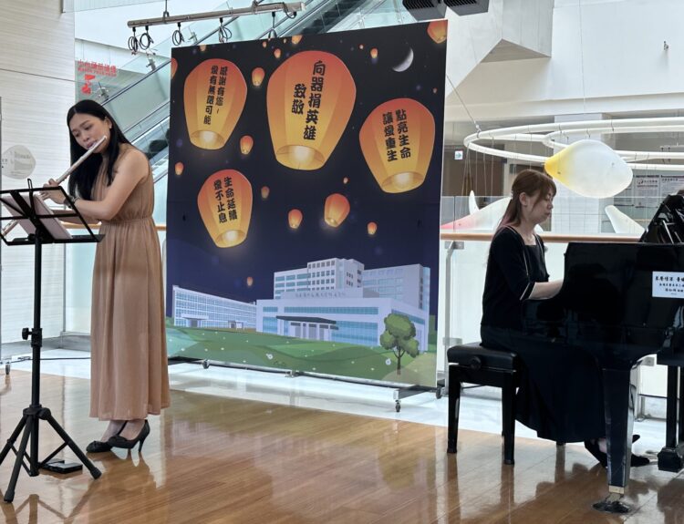 陽明交大醫院從民國93年迄今已協助大愛遺願完成器官組織捐贈計43例,器官捐贈移植團隊自106年至今陸續成功完成「愛留宜蘭」之腎臟移植達17例,醫院為感恩器捐者的無私大愛,讓醫療團隊能牽起這份難得的因緣,讓許多家庭能得到圓滿的機會,特別製作天燈祈福牆,由楊純豪院長、外科部蔡建和主任、器官捐贈者家屬陳女士及腎臟移植受贈者陳先生貼上標語,透過祈福天燈升空意象,將乘載眾人「感恩、追思與祝福」之心聲,向器捐英雄致上深深敬意,謝謝他們為等待的人帶來新生。並由蘭陽交響樂團黃吟賀及石芳瑜老師帶來鋼琴及長笛演奏「嘉禾舞曲」、「幽默曲」、「新天堂樂園」、「O sole mio」及「刻在我心底的名字」等多首動人曲目,盼能以一場充滿療癒能量的音樂饗宴,奏出溫馨的生命樂章。
