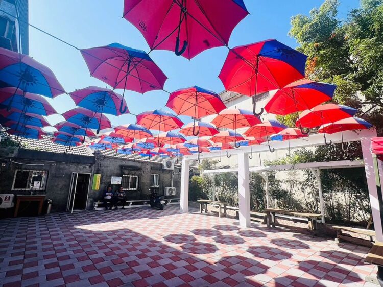 農村水保署南投分署傅桂霖分署長表示,金興村番花道融入了當地產業和街景特色,打造了一個全齡友善的無障礙環境。在鄰近洋傘工廠的區域,灰紅兩色高壓磚鋪設的基底上懸掛著鮮豔的洋傘,形成了一條色彩斑斕的迎賓廊道,成為遊客爭相打卡的熱點。後方中庭則以陶版搭配抿石鋪面,營造出懷舊的氛圍。動線周邊保留了原有的果樹和喬木,並補植了草地、小葉厚殼樹和越橘葉蔓榕等綠植,讓整個環境充滿療癒的綠意。休憩座椅和導覽解說牌的設置,不僅提供了方便的歇腳點,還展示了當地的文化歷史,提升了遊客的停留時間和深度體驗。