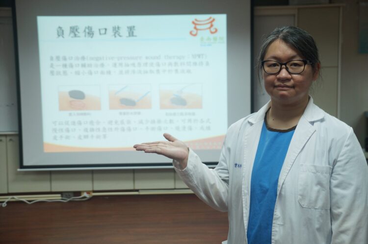 曾琬玲說,負壓傷口裝置已發展超過五十年,在特定慢性傷口的照顧已是醫學實證建議的傷口照顧策略之一,可改善腫脹、促進肉芽組織增生、表皮新生、調節生長因子等多元因素促進傷口癒合;目前本院的治療使用以壓瘡傷口為多。此位燒燙傷的病患則是使用於植皮術後照顧,醫學實證上有正面的研究,在特定族群特定部位可縮短手術時間、改善植皮成功率等好處,術後縮短臥床時間也對年邁病患的整體體力/活動恢復有很正面的幫助,有效改善術後照護的品質。