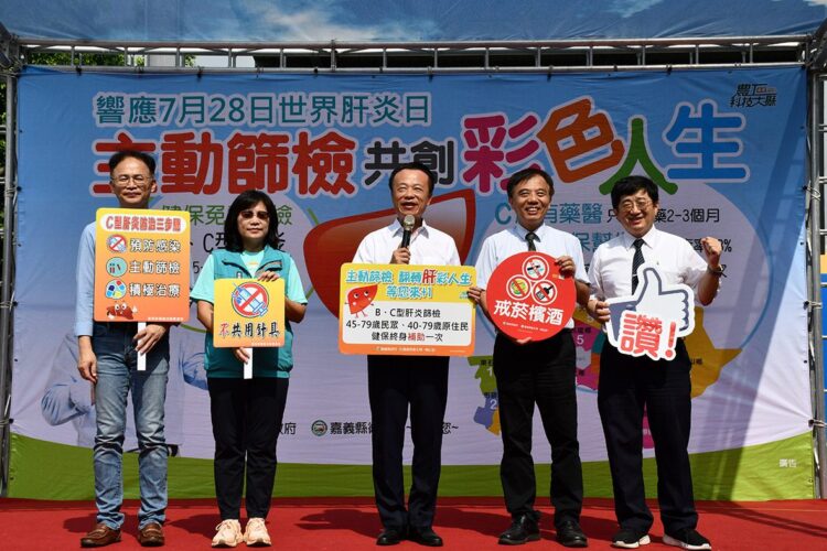 響應728世界肝炎日,嘉義縣衛生局20日於太保國小社區複合式健康篩檢現場,舉辦「主動篩檢~共創彩色人生」宣導活動,透過情境短劇呼籲45-79歲民眾及40-79歲原住民,主動至醫療院所進行成人健檢B、C肝篩檢,終身免費一次檢查。
