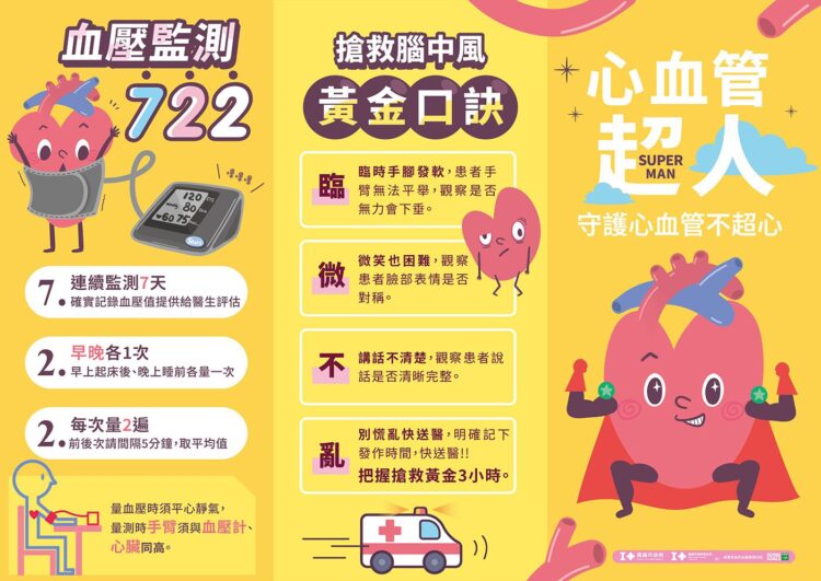 由112年衛生福利部國人死因統計資料觀察發現,高血壓性疾病之死亡率及排行呈現上升趨勢。嘉義市政府衛生局推廣「居家血壓722主題舞蹈」影片,提醒18歲以上民眾一年至少量一次血壓及居家量血壓722的原則,守護心血管健康。
