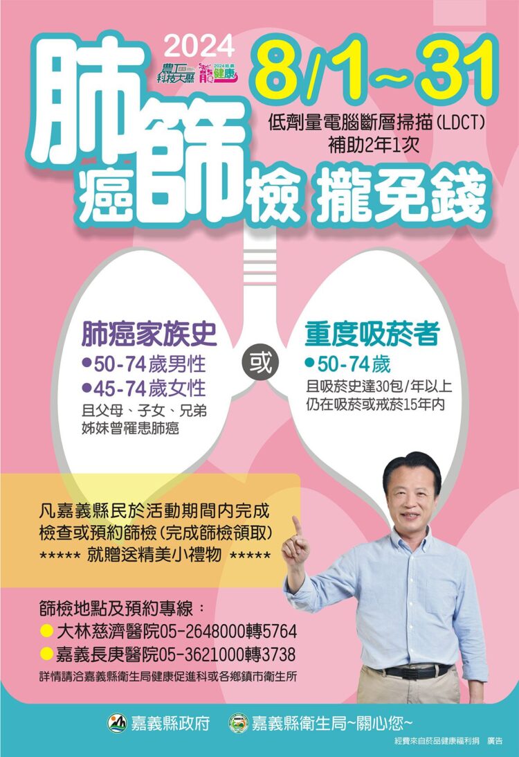 響應8月1日世界肺癌日,嘉義縣衛生局推出篩檢送好禮活動,符合條件的嘉義縣民自即日起至12月31日止,至嘉義長庚或大林慈濟醫院完成低劑量電腦斷層(LDCT)檢查或預約篩檢者,就能獲得精美小禮物,呼籲有肺癌家族史之民眾或重度吸菸者定期接受篩檢,遠離肺癌威脅。