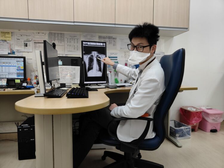 簡單詢問之後發現陳女士過去沒有甚麼特別疾病,而所謂的喘其實已經有數年之久,平時生活無礙但就是運動能力比同儕差上一點,爬樓梯要多休息幾次,利用門診簡易的血氧機檢測發現陳女士在不用氧氣的情況下的血氧約97%,聽診的心音與呼吸音皆正常,邱醫師於是安排了胸部X光與血液檢查,經過半小時的等待,檢查結果顯示無特殊異常,接著邱醫師打開陳女士的胸腔X光片開始解說:「來,這邊是您剛剛照的X光片,人面對我們,這中間是心臟…」突然眼角餘光一閃,邱醫師發現右下角的地方有個若隱若現的白影似乎連著一些管狀的構造,邱醫師心中隱然有了診斷:「陳女士,雖然您的肺部有個多出來的白影,但經驗上來說這應該是良性病灶,您暫時不用擔心,待我們排個電腦斷層檢查之後就明朗了,您的喘應該也有了答案。」
