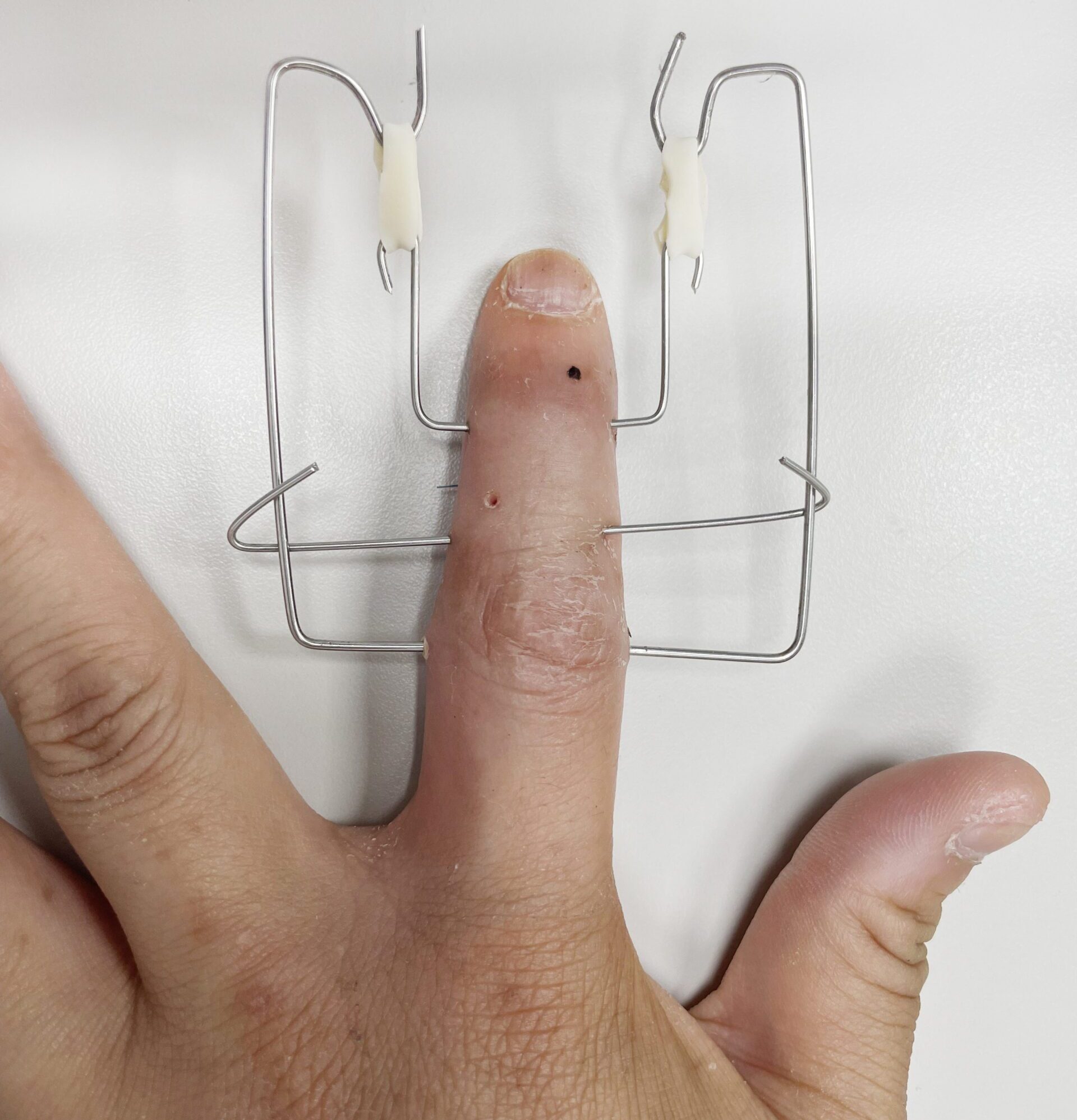 宋卓俍表示,手術的第一部分,採用手指掌側板關節成形術,讓掌側板連同骨折碎片一同復位,重建指間關節受損的關節面,讓關節恢復穩定。第二部分,以醫用鋼線凹製出「Suzuki牽引式外固定器」,在有彈性的橡皮圈牽引下,手指關節會有足夠的穩定度,因此手術後即可開始做關節活動度的復健,避免關節僵硬及肌腱沾黏的狀況。
