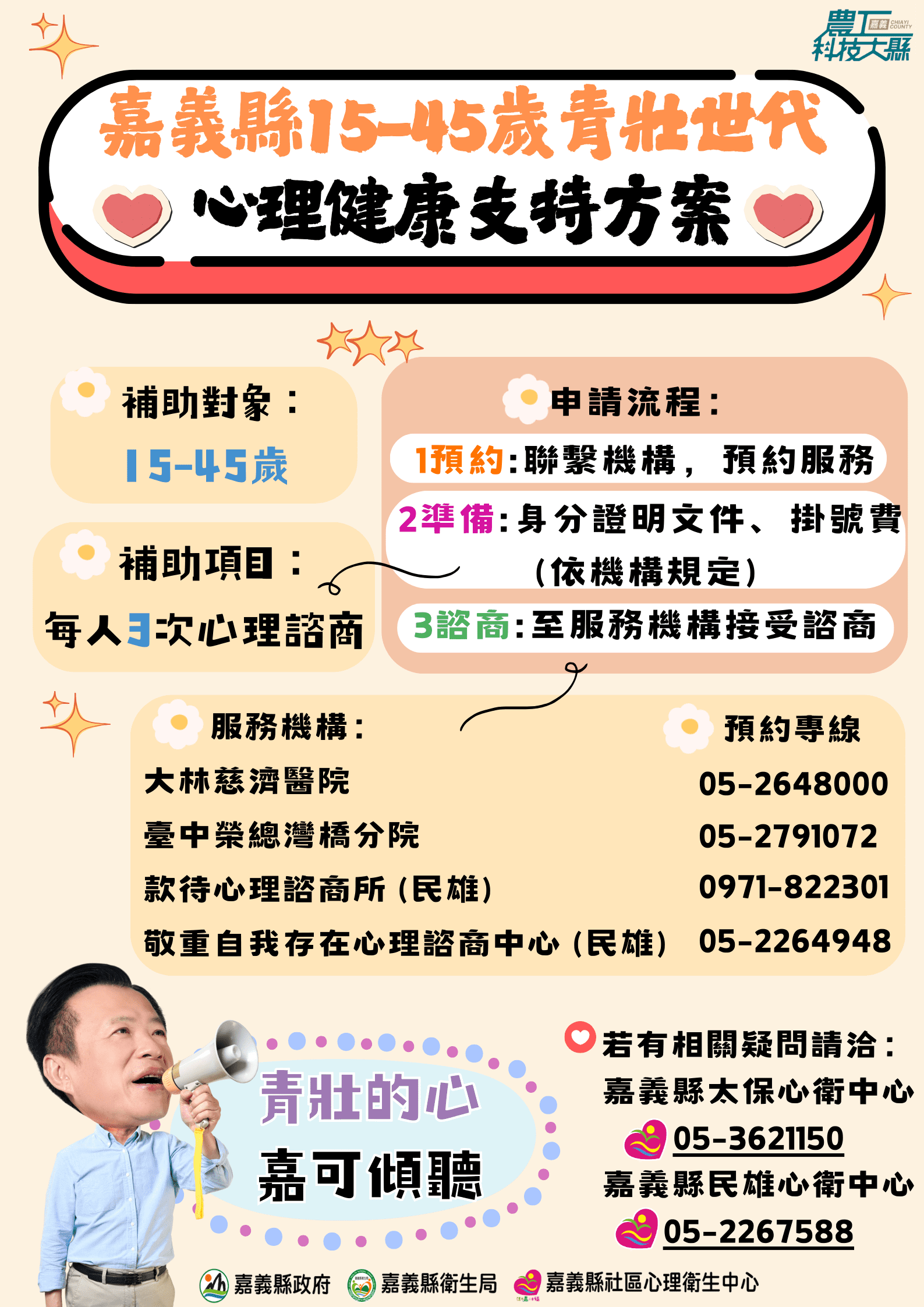 青壯世代正步入「三明治族群」,容易遭遇各種心理迷惘與困擾,有壓力卻不知道如何說出口,嘉義縣四家服務機構包括臺中榮總灣橋分院、大林慈濟醫院、款待心理諮商所和敬重自我存在心理諮商中心,提供15至45歲每人3次心理諮商補助,嘉義縣衛生局社區心理衛生中心也在各鄉鎮市衛生所提供諮商服務,全面照顧嘉義縣民的心理健康。