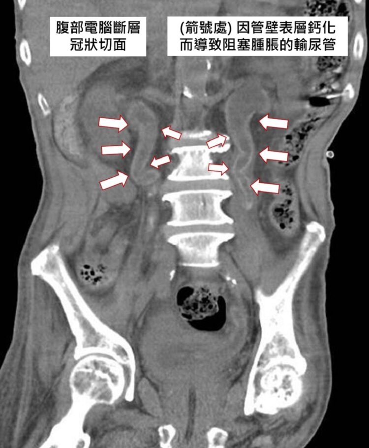 61歲梁姓男子半年內因為泌尿道感染住院多達6次,日前再度發燒及泌尿道感染,轉院到衛福部彰化醫院就醫,多科會診發現,包括腎臟及輸尿管等泌尿道系統被一層像是水泥、蛋殼的鈣化物覆蓋,被稱為Encrusted uropathy(結殼性泌尿系統病變),因此造成泌尿道長期發炎,急性腎臟功能惡化。
